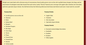 • Outdoor Grill: Serves hot dogs, burgers, tacos, corn dogs, and other delicious options.